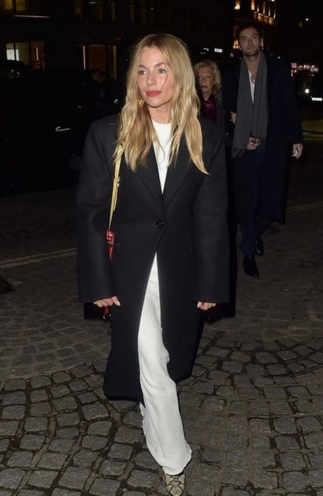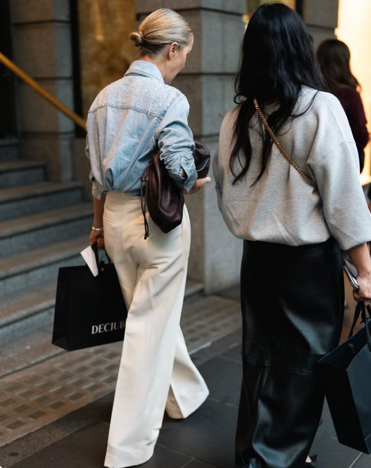 Your favorite denim shirt with the Regenerative White Trousers, this clutch AND James over a leather skirt, Alice or Deborah and these shoes again. Also love both of their hair!